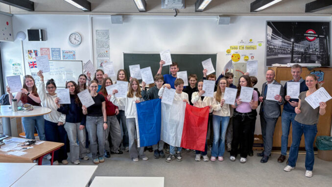 Am Donnerstag, den 19.3., übergab unser Schulleiter Herr Mertens an 33 Schüler/-innen ihre vorläufigen Diplome für die bestandenen DELF A1- und A2-Prüfungen. Die von Herrn Bigalke und Frau Hübner vorbereiteten Schüler/-innen hatten sich seit Schuljahresbeginn einmal wöchentlich in einer freiwilligen AG vorbereitet und im Januar ihre Hörverstehens-, Leseverständnis- und Textproduktions- und Sprachkompetenz in der französischen Sprache in freiwilligen Prüfungen des Institut français unter Beweis gestellt. Nun kamen endlich die Ergebnisse und alle angetretenen Schüler/-innen hatten wie erwartet bestanden. Milla Bodenschatz erreichte sogar 95 von 100 möglichen Punkten. Wir gratulieren stolz unseren erfolgreichen Schüler/-innen zu ihren tollen Leistungen.